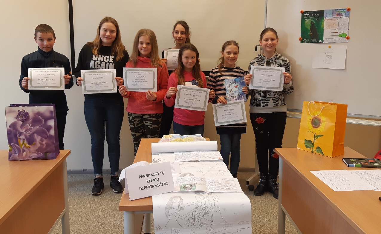 Antroje pamokos dalyje aptarti  gimnazijos bibliotekos inicijuotos akcijos ,,Šimtas knygų – ne riba“ rezultatai.  Akcija,  skirta Nepriklausomybės atkūrimo šimtmečiui,  paskelbta pernai, o šiemet jau skaičiuojame rezultatus.  Gimnazijos direktorė pasidžiaugė skaitančiais mokiniais ir įteikė padėkos raštus bei atminimo dovanėles.  Padėkos raštais už aktyvų dalyvavimą akcijoje ,,Šimtas knygų – ne riba“ apdovanotos Nėja Svitovaitė ir Sandra Buividavičiūtė (5 kl.), Ugnė Okunevičiūtė, Jovita Zagorulko ir Viktorija Ruseckaitė (7 kl.).  III vietą užėmė Kamilė Glebutė, antroji buvo Gabija Tamkevičiūtė,  daugiausiai knygų perskaitė Augustas Banuškevičius. Visi prizininkai yra šeštos klasės mokiniai.