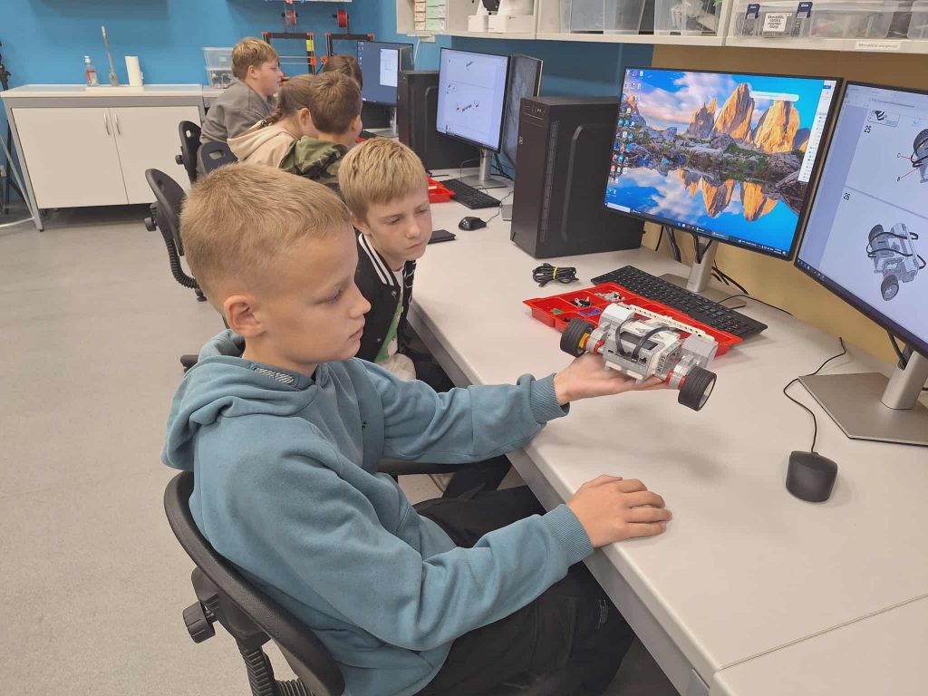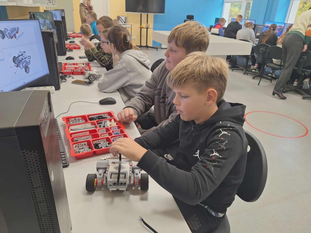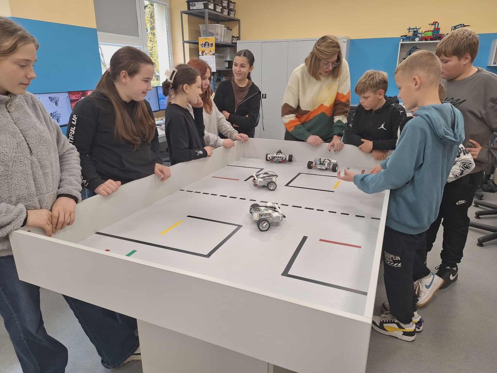 Robotikos laboratorijoje mokiniai ne tik konstravo robotus, bet ir programavo juos taip, kad šie įveiktų sudėtingą matematinį labirintą. Kiekvienas pasijuto tikru inžinieriumi, kai jų sukurtas robotas sėkmingai pasiekė tikslą!