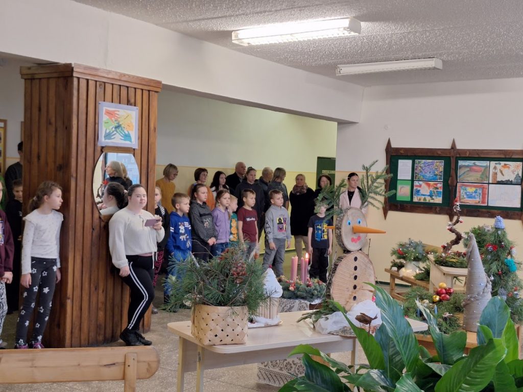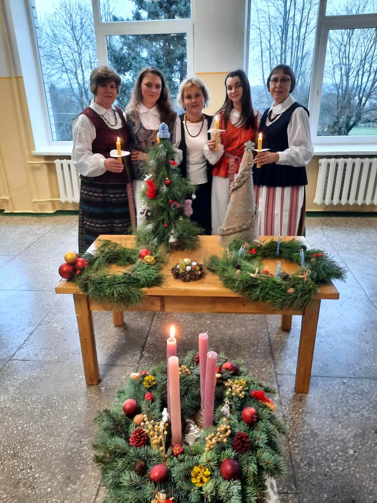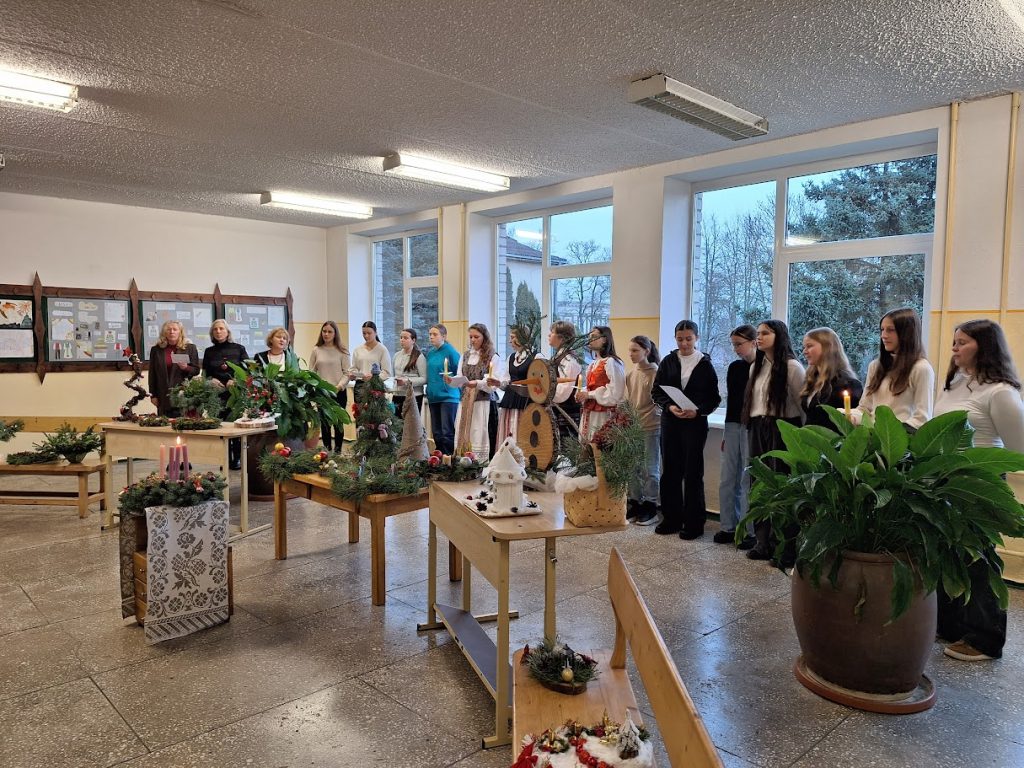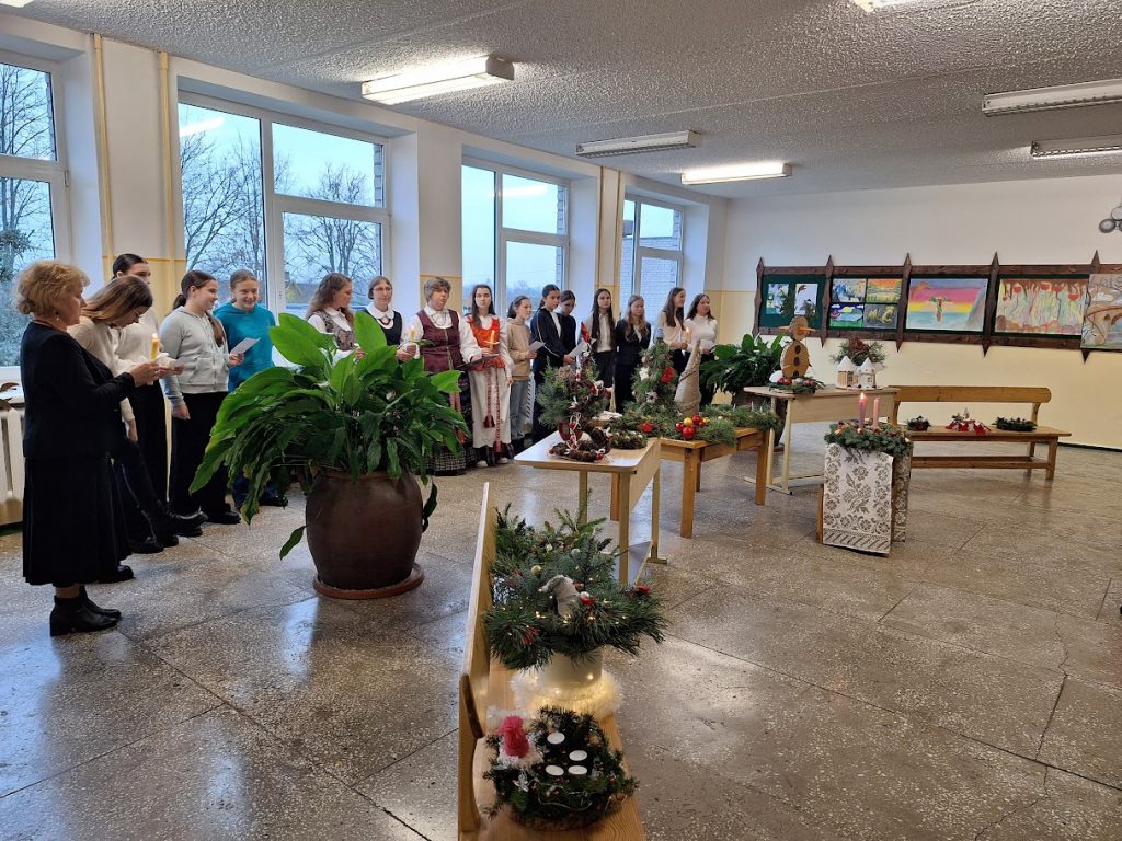 papuošti vainikai, sukonstruotos eglutės ir kitos dekoracijos jau puošia mokyklos kabinetus ir koridorius, ruošiami karpiniai langams, atkeliauja knygos, žaislai. Spindi pirmoji Advento vainiko žvakutė. Norėdami, kad Meilė, Gerumas, Viltis ir Džiaugsmas pasibelstų į mūsų bendruomenės narių širdis ,,Etnokultūros sodų“ (vadovė mokytoja Nijolė) ir etnografinio ansamblio ,,Šermukšnėlė“ (vadovė mokytoja Gražina) kolektyvų nariai sukvietė visus padainuoti adventinių dainų. Kartu paminėjome ir 2025 metus – lietuvių liaudies dainų metus. Prieš 200 metų išleistas pirmasis Liudviko Rėzos lietuvių liaudies dainų rinkinys padėjo pagrindus lietuvių folkloristikos pradžiai.