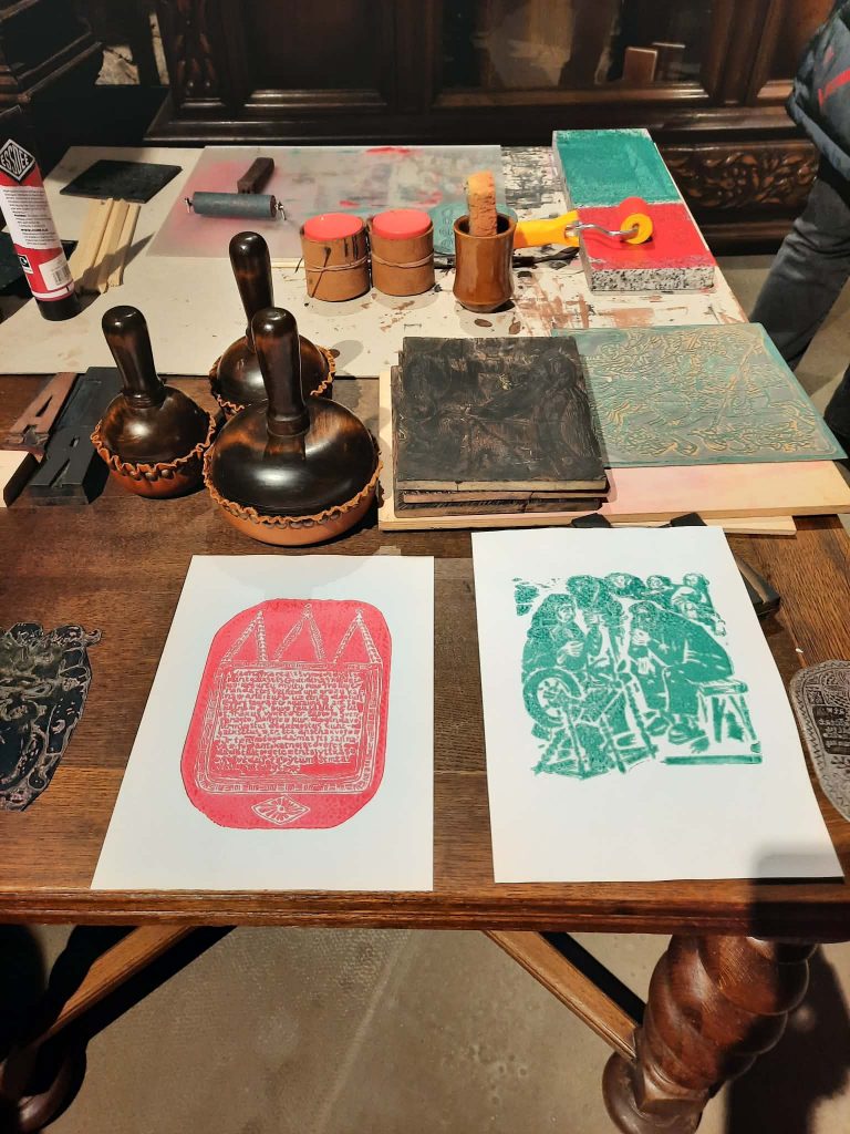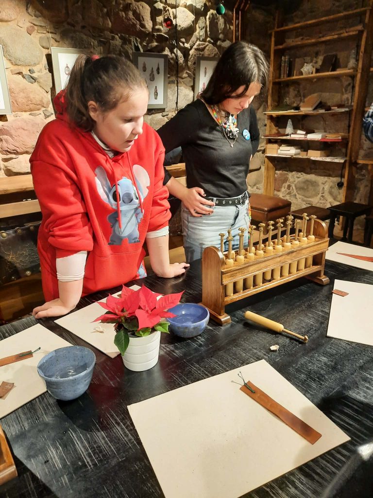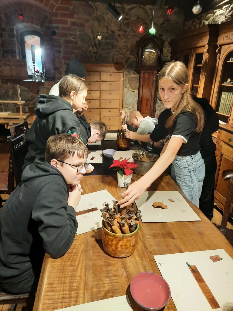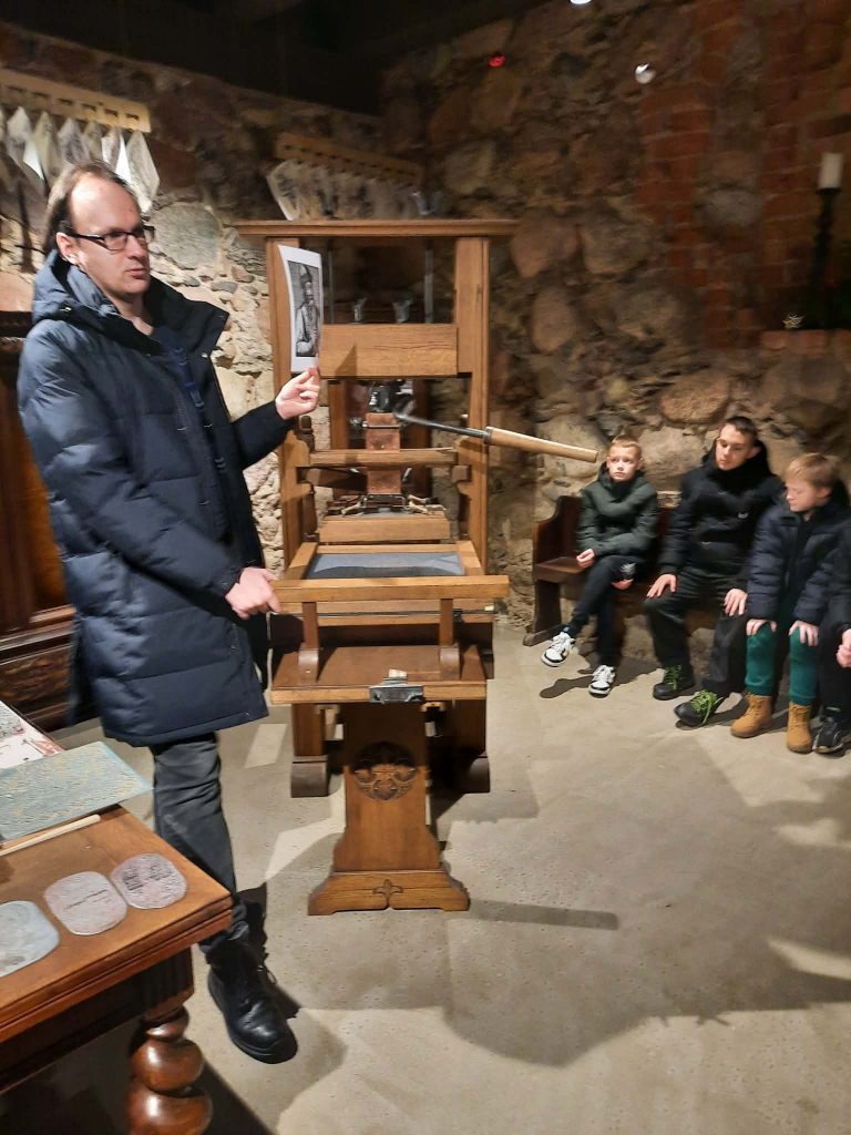 O grįždami iš Vilniaus užsuko į Trakų pusiasalio pilį. Pilies bokšte įrengtoje edukacijų erdvėje mokiniai klausėsi pasakojimo apie pirmąsias ranka rašytas knygas, vienuolynuose dirbusius skriptorius, senų knygų išlikimą, saugojimą, vertę. Edukacijoje ,,Knygų spausdinimo paslaptis – J. Gutenbergo išradimas“ sužinojo apie spausdintos knygos kelią. Vokiečių spaustuvininko Gutenbergo rankinis presas knygoms spausdinti pakeitė knygų rašymą ranka. Raidės, presas, rašalas, popieriaus ir geras spaustuvininkas pagreitino knygos atsiradimą. Mokiniai išbandė patys rankinį presą – atsispausdino pasirinktus atvaizdus ir tekstus. Praktiškai pasimokė įspausti raides ir ženklus, pasigamino odinį skirtuką, jį papuošė užrašydami savo vardą ar palinkėjimą.