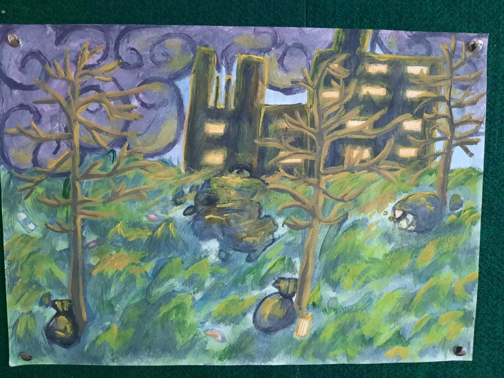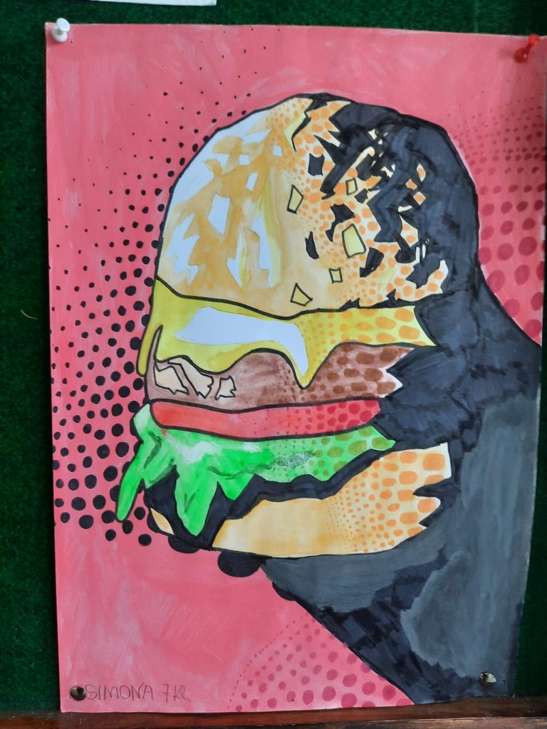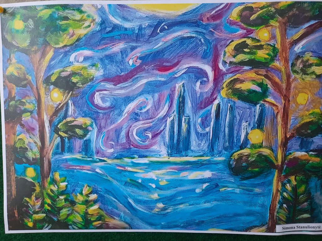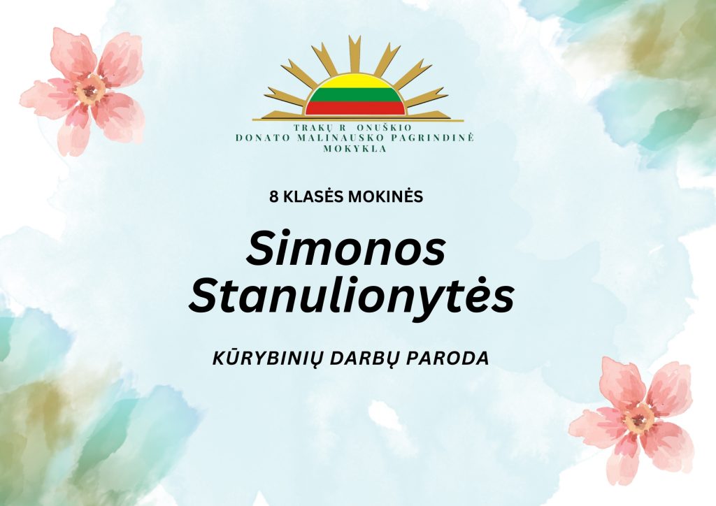 Mokykloje pirmą kartą eksponuojami 8 klasės mokinės Simonos Stanulionytės dailės darbai. Akį traukia gyvi, spalvingi, didesnio formato piešiniai. Simona sako, kad piešti pamėgo dar vaikystėje įvairiausiais pieštukais. Reikėjo tik patogiai įsitaisyti, susikaupti ir mintys, ką piešti, pačios lįsdavo į galvą. ,,Man net nereikia jokio įkvėpimo, idėjos pačios ateina“,- sako kūrybinga mokinė. Darbų jau sukaupta nemažai. Mokytojo paraginta ryžosi parodyti visiems, kokį pasaulį mato ir kaip pavyksta pavaizduoti tai, kas labai svarbu jaunam žmogui.