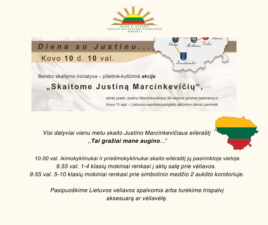 10.00 val. ikimokyklinukai ir priešmokyklinukai skaito eilėraštį jų pasirinktoje vietoje.