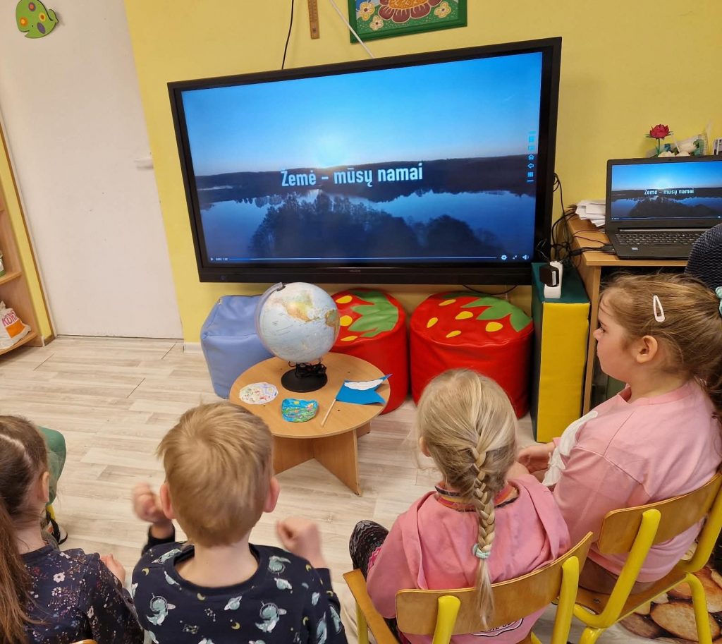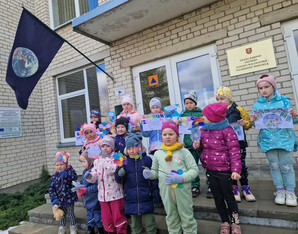 Vėliau visi kartu skubėjome prie mokyklos, kur jau iškilmingai plevėsavo Žemės vėliava. Vaikai susidomėję tyrinėjo jos spalvas ir džiaugėsi jų atspindžius atrasdami savo sukurtuose darbeliuose. Grįžusių į darželio kiemą mūsų laukė pati didžiausia gamtos dovana – stebėjome virš galvų besidriekiančias ilgas parskrendančių paukščių virtines. Šimtai sparnuočių ir jų garsūs balsai dar kartą priminė, koks nuostabus ir gyvas yra pavasaris, kurį mes pasižadėjome saugoti.