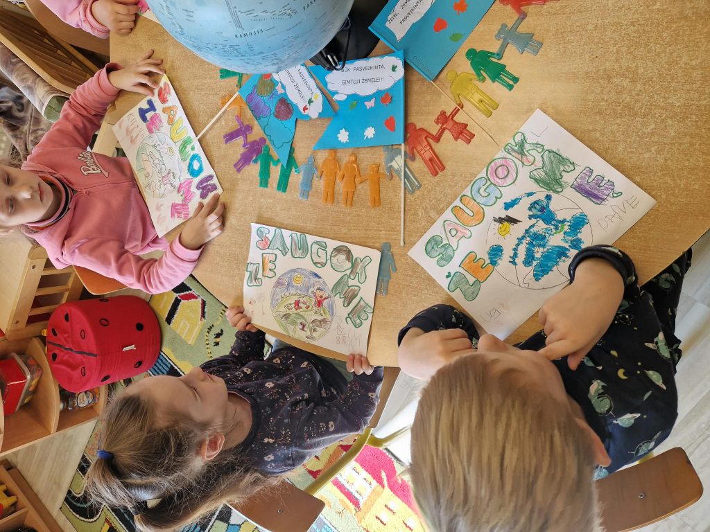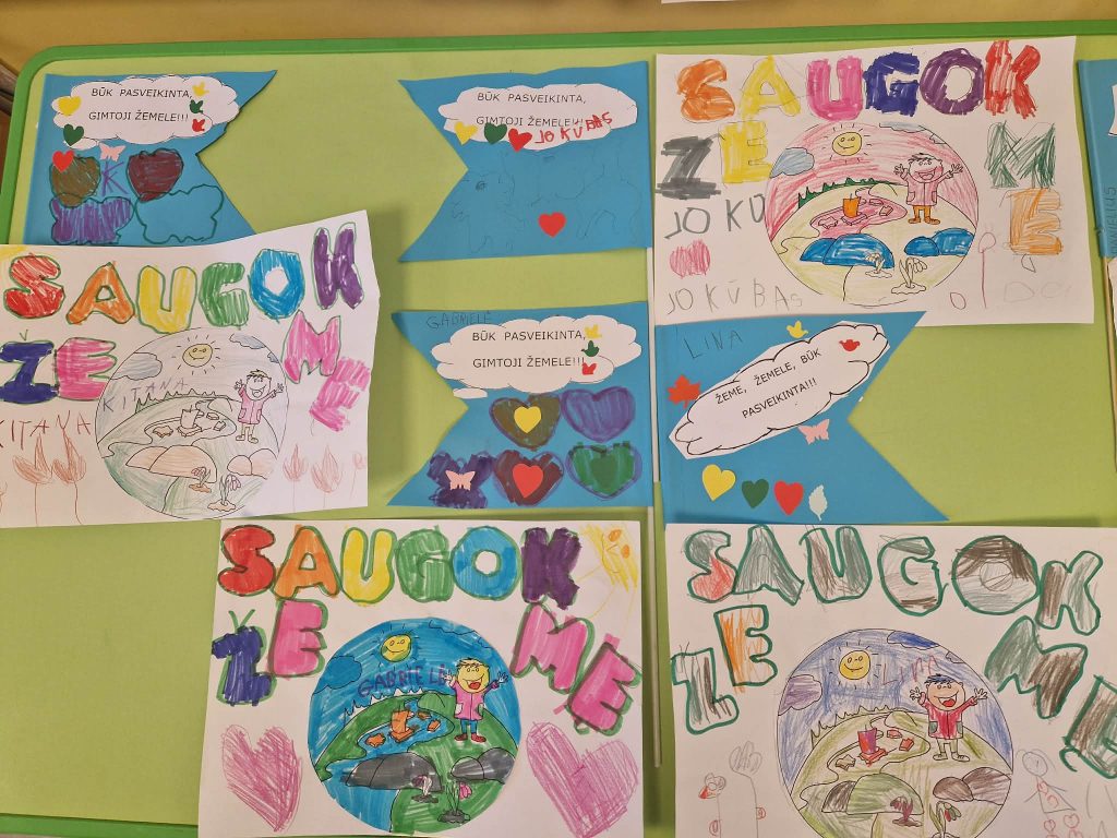 Rytą pradėjome spalvindami pavasariškus paveikslėlius ir kalbėdamiesi apie tai, ką mums reiškia Žemė. Diskutavome, kodėl privalome rūpintis jos švara, kokią žalą gamtai bei vandeniui daro tarša ir kaip kiekvienas iš mūsų gali prisidėti prie aplinkos saugojimo. Stebėdami edukacinį „Kakės Makės“ reportažą, vaikai sužinojo, kas yra lygiadienis ir kodėl nuo šiol šviesusis paros metas taps vis ilgesnis. Supratome, kad būtent dabar prasideda tikrasis, o ne tik kalendorinis pavasaris, kurį bendruomeniškame rate kartu ir žadinome. Savo pasiryžimą saugoti planetą mažieji išreiškė kūrybiškai: iš spalvingų, dekoruotų raidžių sudėliojome šūkį „SAUGOK ŽEMĘ“, sukūrėme bendrą plakatą, kuris tapo mūsų visų pažadu tausoti gamtą. Kiekvienas vaikas iškirpo ir papuošė pasveikinimo vėliavėlę.