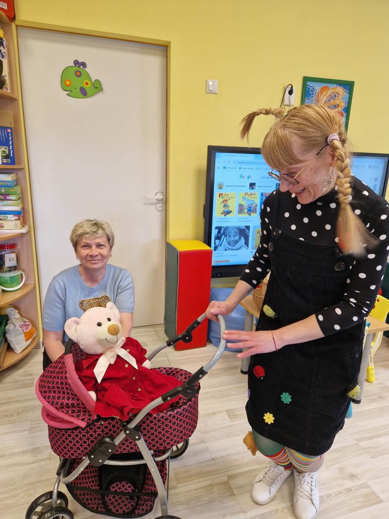 Susitikimas tapo tikra švente: Pepė pasirodė nešina glėbiu meškiukų, o vaikai ją pasitiko itin šiltai. „Žodžių kišenėje neieškanti“ viešnia greitai rado bendrą kalbą su ugdytiniais – jie ne tik kartu žaidė, bet ir drąsiai kalbino Pepę, siūlė vardus jos meškiukams bei dalijosi įspūdžiais. Pepė taip pat negalėjo atsigėrėti gausia mokyklos žaislų ir edukacinių priemonių įvairove, kurios ją, atvykusią iš kitokio laikmečio, labai nustebino.