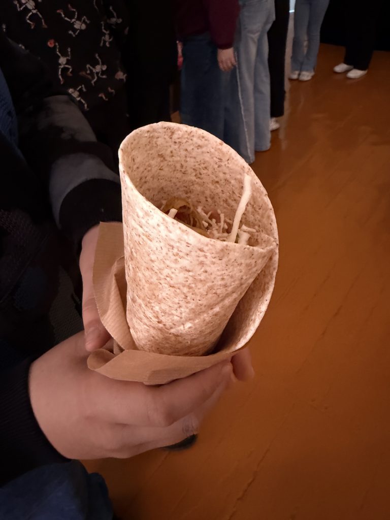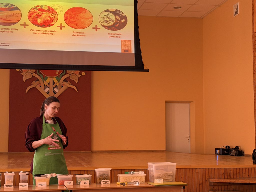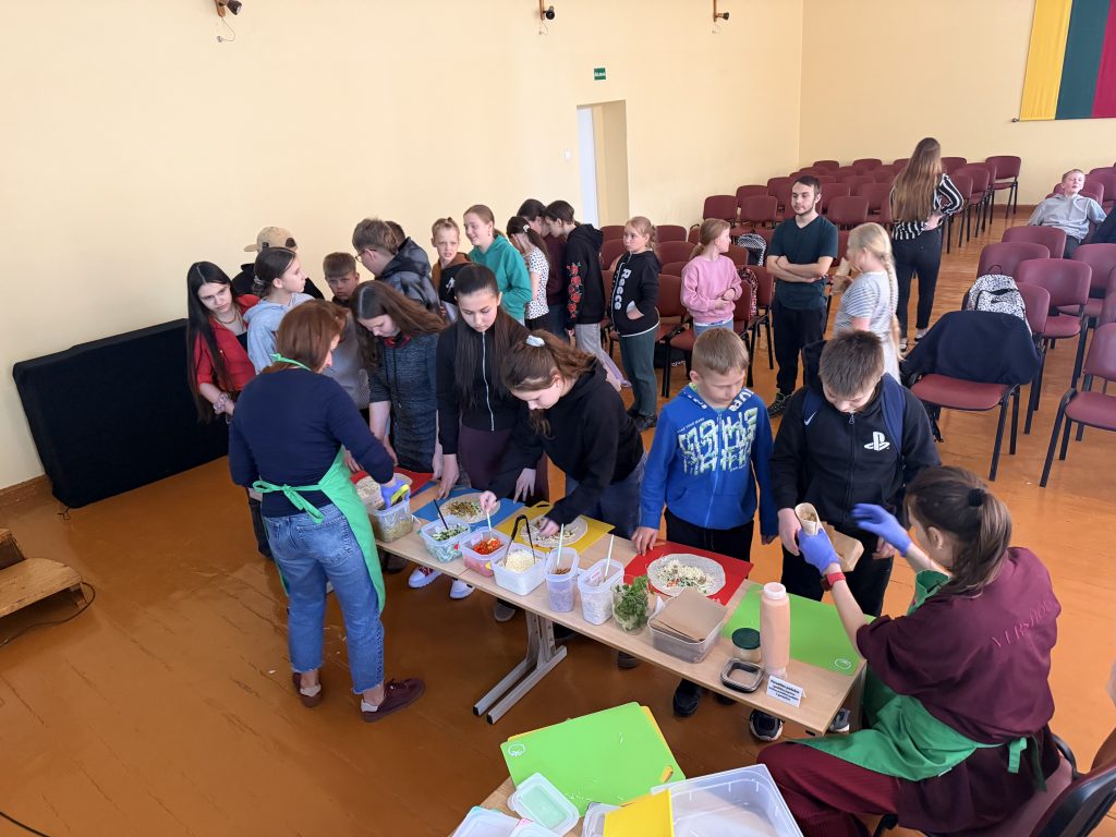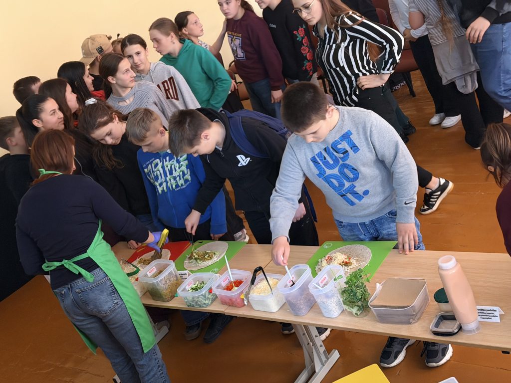 Paskaitos metu mokiniams buvo aiškinama, kaip subalansuota mityba veikia žmogaus savijautą, augimą ir energiją. Buvo aptarta, kokie maisto produktai yra naudingi organizmui, o kurių reikėtų vartoti rečiau. Mokiniai sužinojo, kaip atpažinti sveikesnius produktus, skaityti etiketes bei kodėl svarbu vengti perteklinio cukraus, druskos ir perdirbtų maisto produktų. Didelio susidomėjimo sulaukė praktinė veiklos dalis. Jos metu mokiniai patys gaminosi tortilijas – rinkosi ingredientus, derino skonius ir mokėsi, kaip paprastai bei greitai galima pasigaminti sveikesnį užkandį. Ši veikla skatino kūrybiškumą, bendradarbiavimą bei ugdė praktinius įgūdžius.
